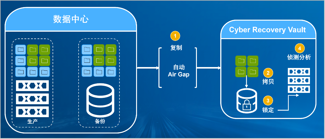 云闪付防勒索病毒方案将生产中心备份数据复制到Vault区,复制后网络自动断开实现弹性隔离。Vault区的数据快速拷贝,并对拷贝版本加锁(在锁定期数据不允许删除和修改)。Vault沙箱内对拷贝版本进行扫描分析,验证数据是否完好。